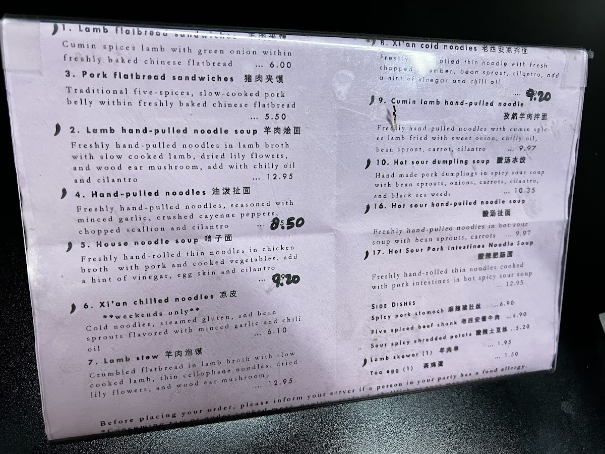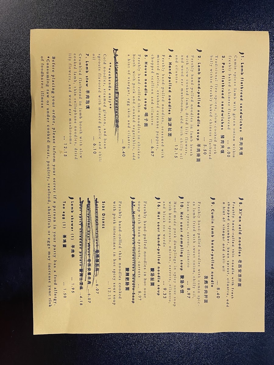 Crumbled flatbread in lamb broth with slow cooked lamb, thin cellophane noodles, dried lily flowers, and wood ear mushrooms.